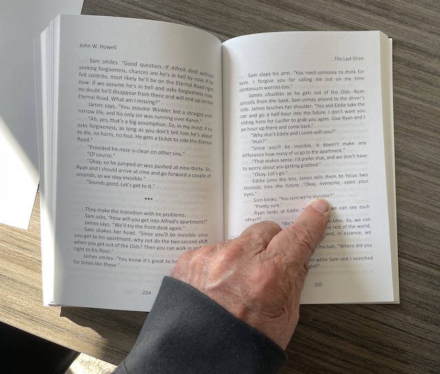 The prompt is found by opening a book to a random page and, without looking, point to the page. The word or words closest to the pointing finger is the prompt. Today, I opened The Last Drive to page 205, and when I opened my eyes, the word invisible was nearest my finger.