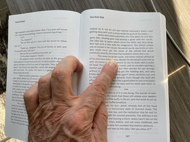 Today we opened The Eternal Road on page 147. The word closest to the pointing finger is ‘asleep.’
