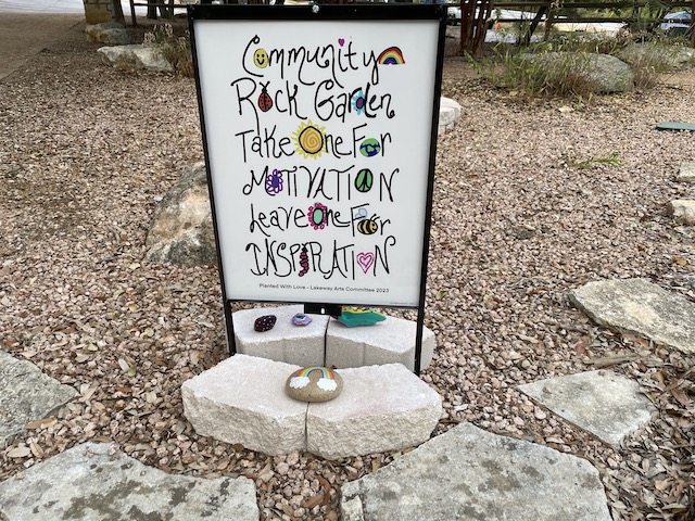 Today, we will go to the Greenbelt to look at a newly installed feature, which is inspirational rocks. We are also going to the Activity Center to see some kids creating rocks. We are being catered by L’oca D’oro of Austin. Our entertainment is Simon and Garfunkel.