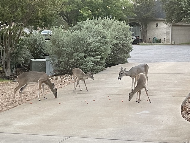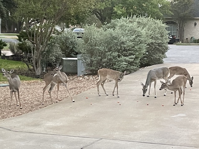 My heavenly days! You’ve got that many deer on your driveway all at once?? If I hadn’t seen the picture, I’m not sure I’d have believed it. Wow! And what are those things on the ground? Are you feeding them, too??!