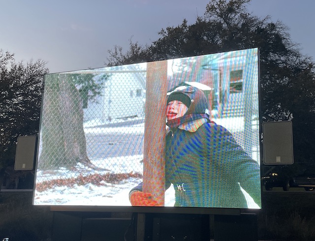 The giant screen is playing A Christmas Story and one of the best scenes.