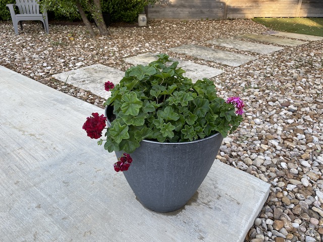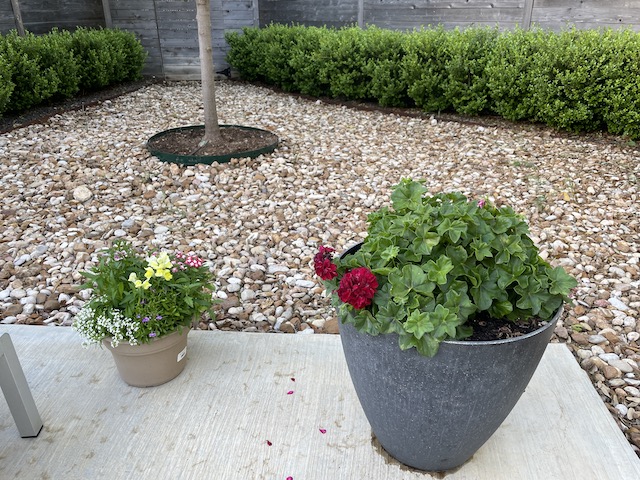 Geranium and snapdragons. The boxwood hedge in the background looks good.