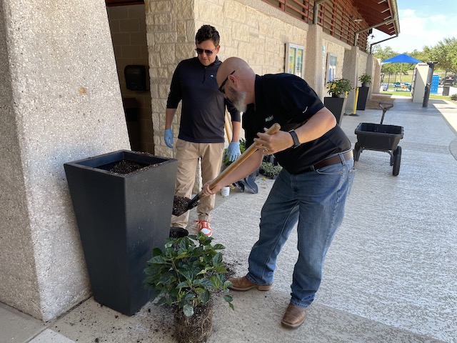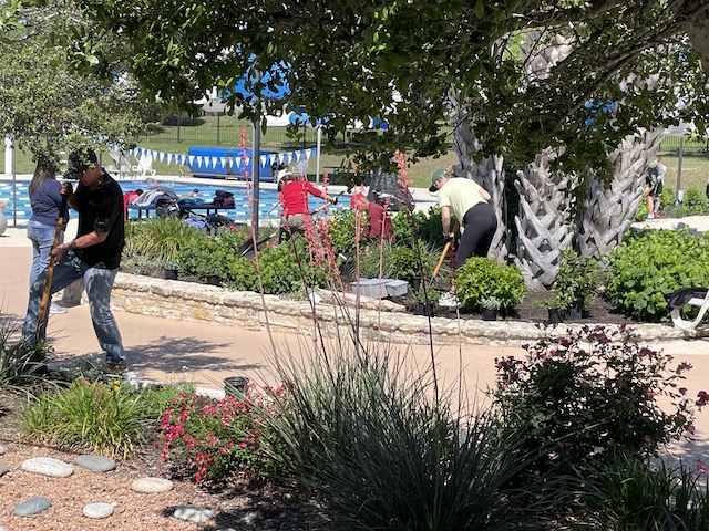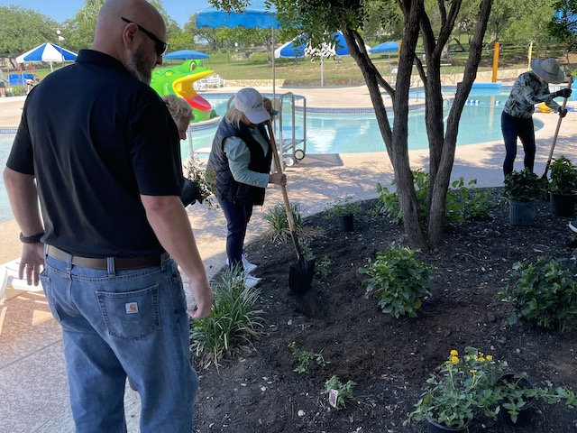 In celebration of Earth Day last Monday, the Swim Center and the Department of Parks and Recreation of Lakeway held a planting event. Volunteers signed up to plant blooming plants throughout the center. So, we will step back in time and witness the event. We are catered by the 24 Diner of Austin, and our entertainment is The Beetles.