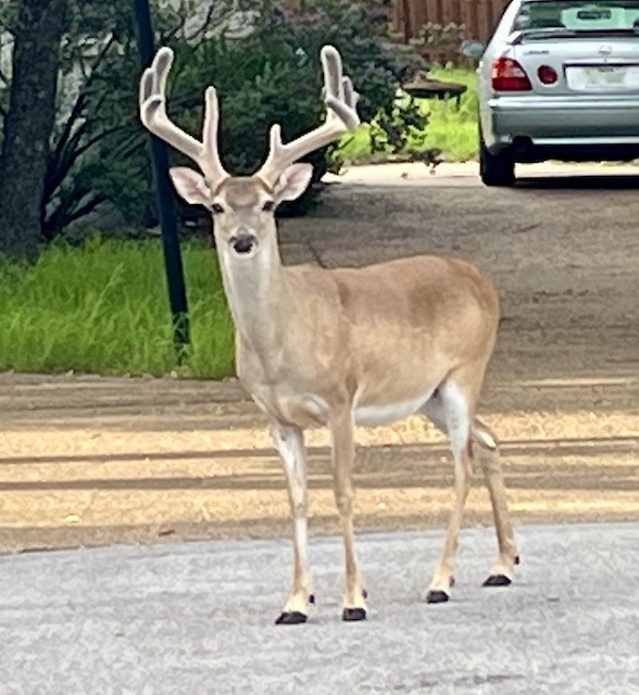 There is always something interesting to see in your neighborhood, John! I love the flags to celebrate the 4th – and I’d love to feel the velvet on the deer’s horns!