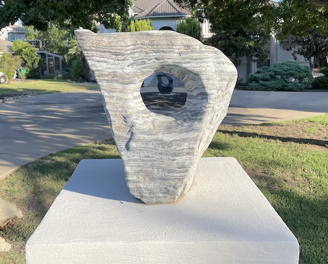 The mailbox topper is in the foreground with a sightline to another sculpture in the background.