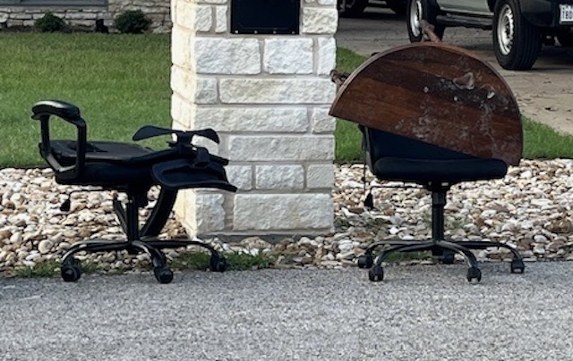 Love the deer photos, John. If you hadn’t added “with sister,” I might have missed the little one in the background of dad and lad. I had to laugh at the broken office chair. I’m trying to imagine how that happens.
