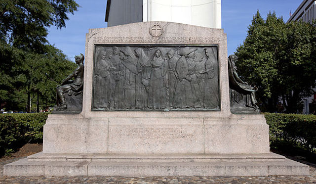 On the granite above the relief is inscribed: THEY COMFORTED THE DYING, NURSED THE WOUNDED, CARRIED HOPE TO THE IMPRISONED, GAVE IN HIS NAME A DRINK OF WATER TO THE THIRSTY.