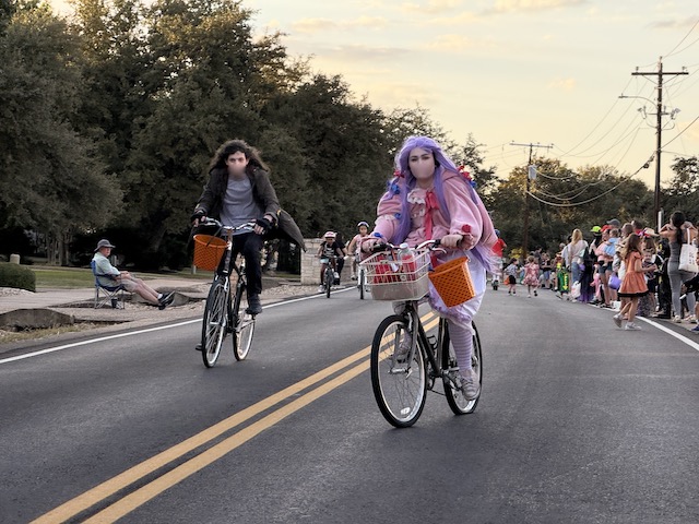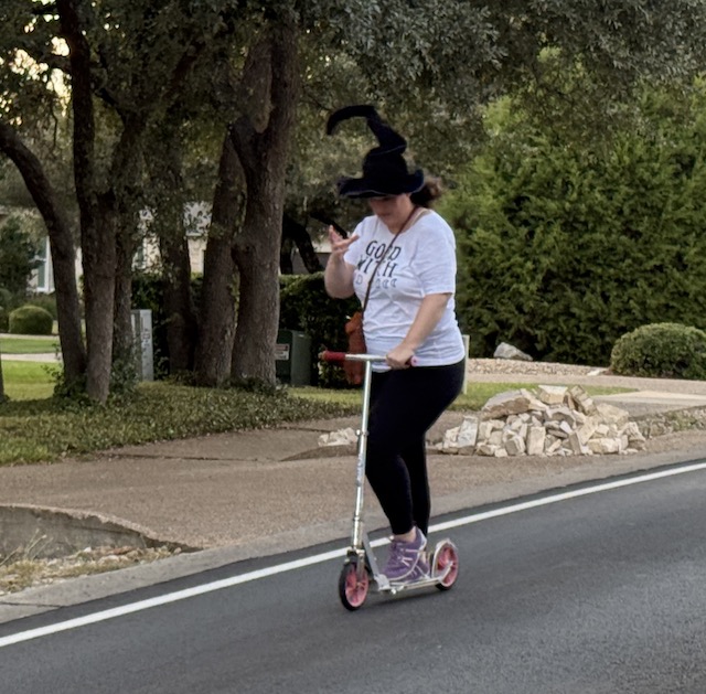 Today, we are celebrating Halloween with the Witches Ride in Lakeway. This is an annual event, and we don’t want to miss it. Kids dress up and take a one-mile ride on anything that doesn’t have a motor. After the ride, there is a carnival for more fun. We will be eating carnival food, and our entertainment is Michael Jackson.