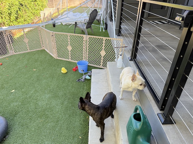 Our tent was to keep the blazing sun off the turf so these guys could play in the yard. The tent is back up so no harm. Looked worse that is was. Thanks Staci. They love those belly rubs.