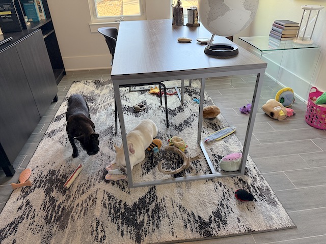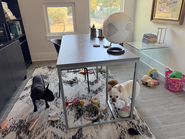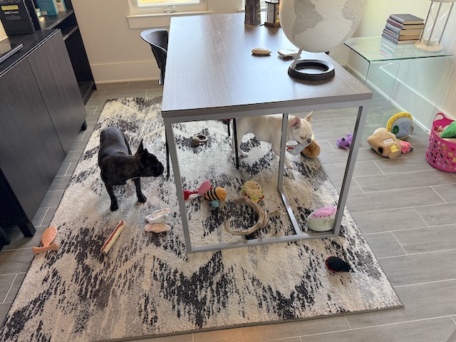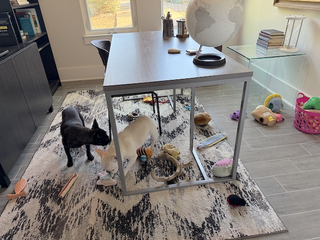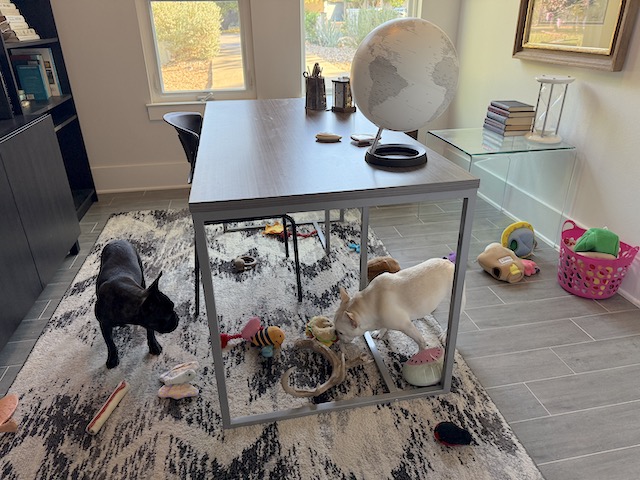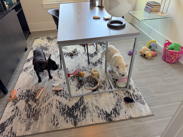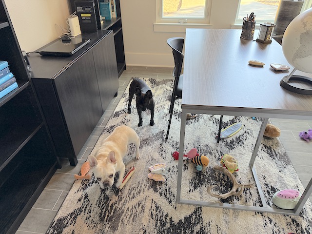 Twiggy and Tempeste need to come here. It is 80 again today – the lowest we’ve gotten is maybe 62 so far this winter. Ugh. But the girls are like little kids with their toys – always wanting what the other has – and your office looks like our family room use to look – toys everywhere. They aren’t spoiled much, are they?