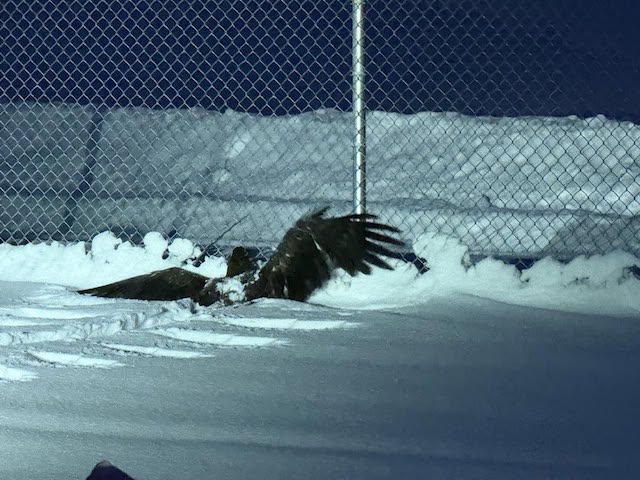 A good Samaritan came across the “quite frozen” eagle that couldn’t fly on the evening of Jan. 11 and waved over a Fairbanks International Airport police officer, the Fairbanks Airport Police and Fire Department wrote in a Facebook post.