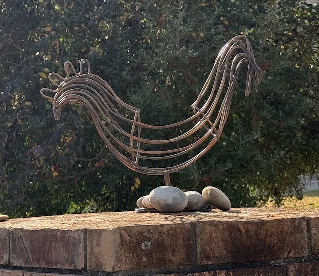 A wire hen with stone eggs.