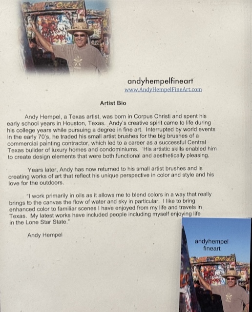 After last week’s disaster, I’m happy to report that this week’s trip to the Lakeway City Hall Art show will be a success. The lights and art cooperated.  We are catered by Stella San Jac of Austin. Our entertainment is Don McLean.