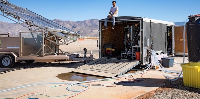 Co-inventor Jon Bessette sits atop a trailer housing the electrodialysis desalination system – credit Shane Pratt, via MIT Press