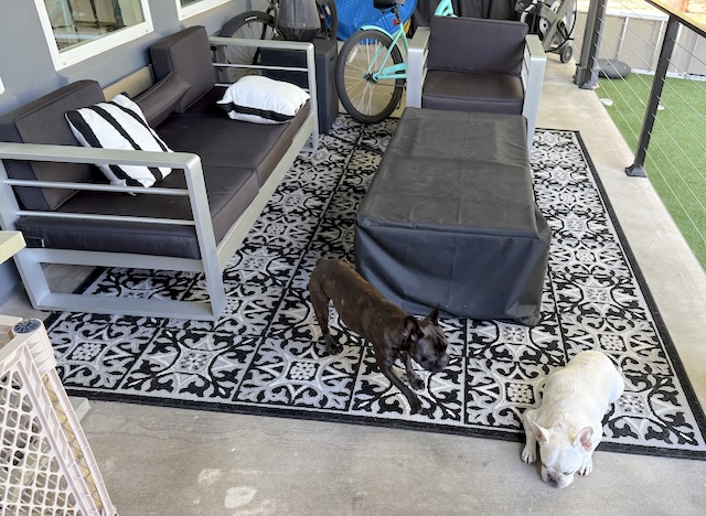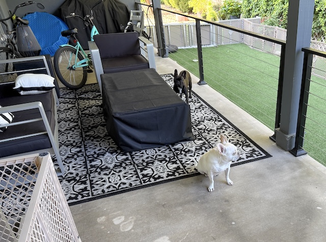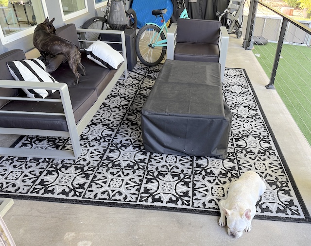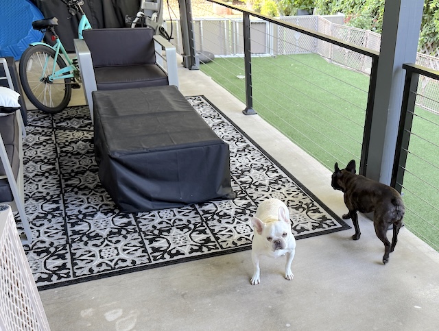Are Frenchies Velcro dogs, too? The reason I ask is that Monk is, for sure. He’s GOT to know where I am at all times, and he frets big time if he doesn’t. Hide-and-Seek is not his favorite game, as you can imagine! By the way, I’m with Linda on that black and white rug – it’s gorgeous!