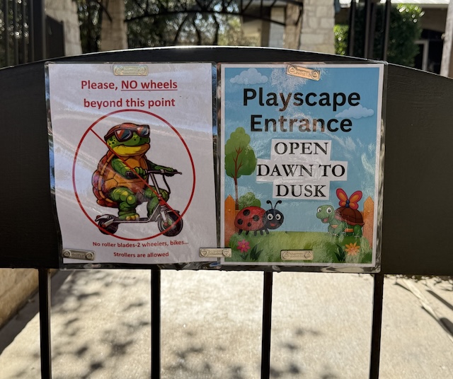 The playground looks like a fun place for children and adults. I see that the planners were smart and put up shades and put down light-colored ground. Here in Tallahassee, several years ago, they constructed a playground at a local park and laid down a BLACK ground cover of chewed up tires. It wasn’t long before parents complained of their kids getting burned when they fell on the ground.