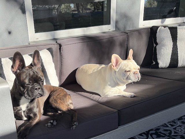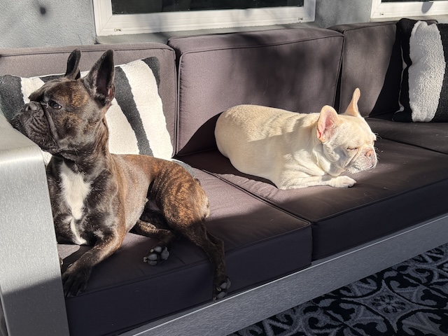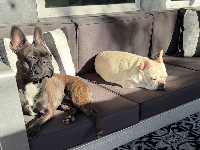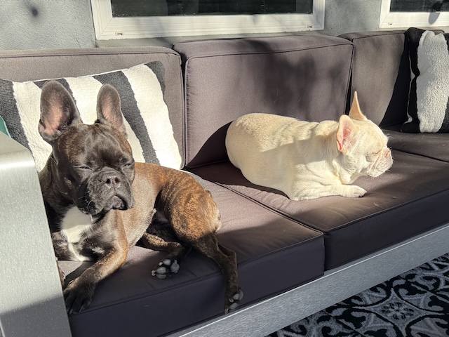 They’re lovin’ that bit of sun! Probably best they don’t have a doggie door., bless them.