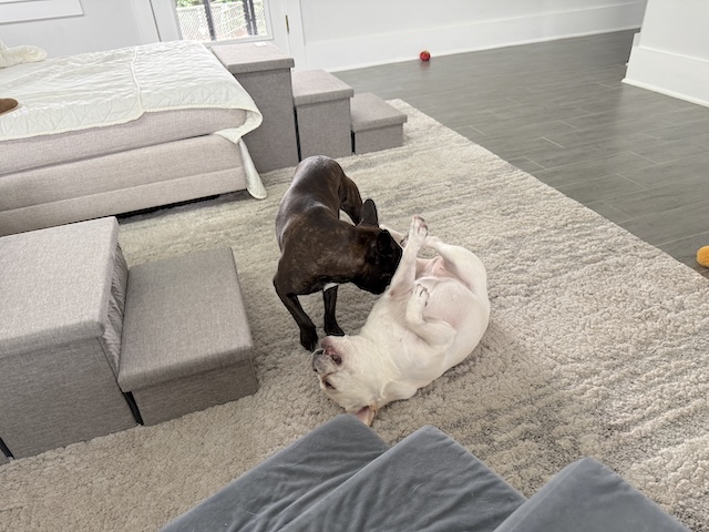 They look like they are having fun – hard to take their ‘battle’ seriously. And I love it when they roll over on their backs – submissive to each other? Never a dull moment with those two!