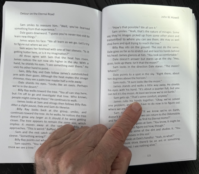 Today I randomly opened Detour on the Eternal Road to page 121. With eyes closed, I pointed to the page. My finger fell closest to the word “hands,” which is our prompt today.