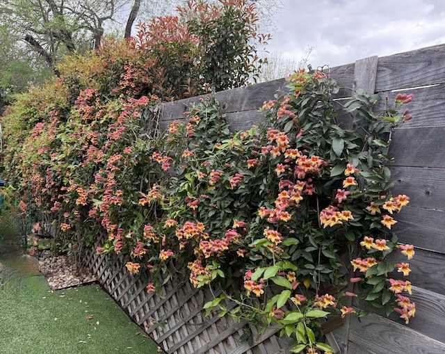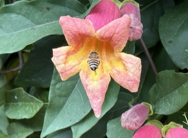 What could be a better sign of Spring than a honey bee hovering over a crossvine bloom?