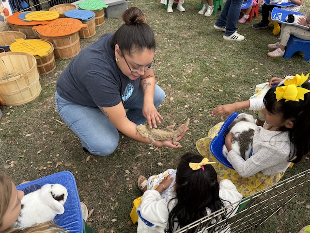 A petting zoo with bunnies and a bearded dragon.