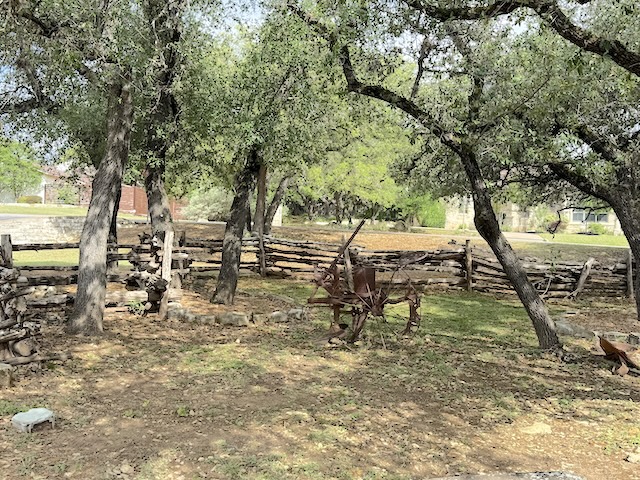 Vintage farm equipment around the cabin.