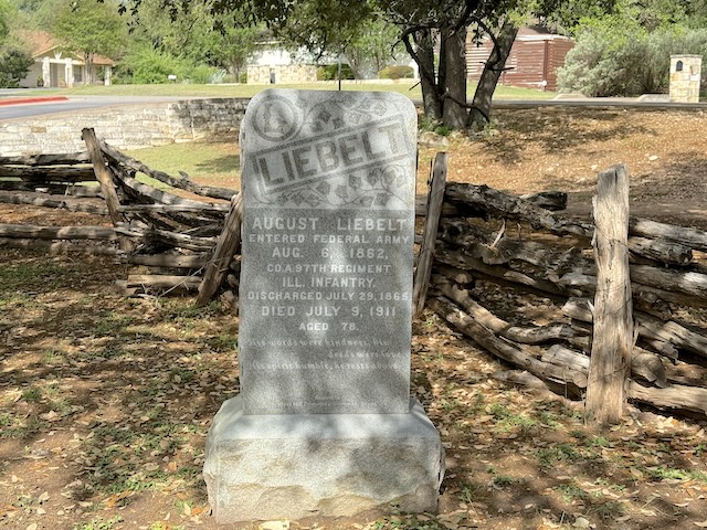 A replica of the marker for August Liebelt, who built and lived in the cabin.