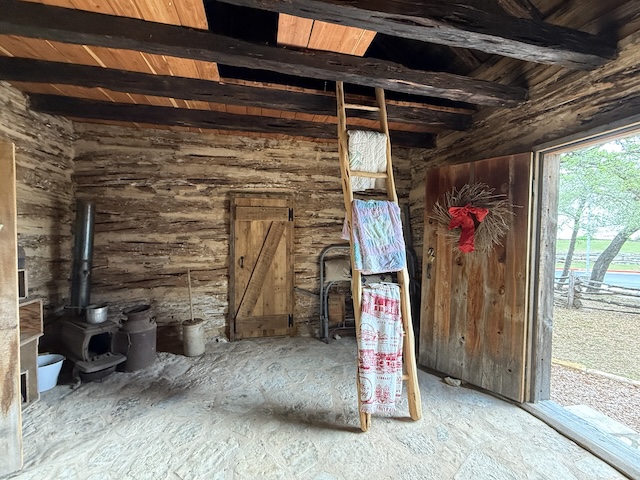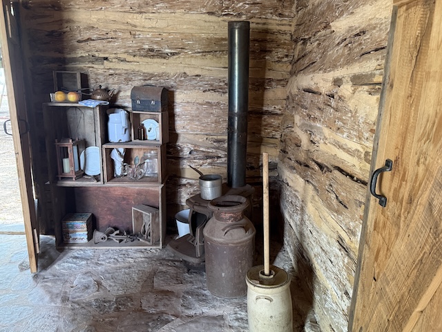 Looking back toward the stove and at the ladder to the second story. Note that the cabin had three doors, which provided plenty of ventilation.