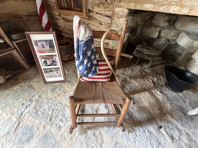 The old rocker and cane. The framed photos are of members of the Historical Society at various functions in the cabin.